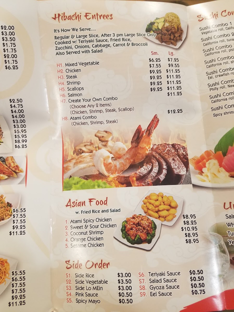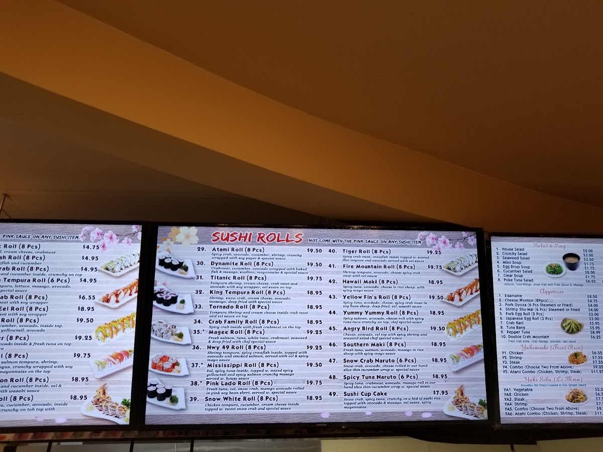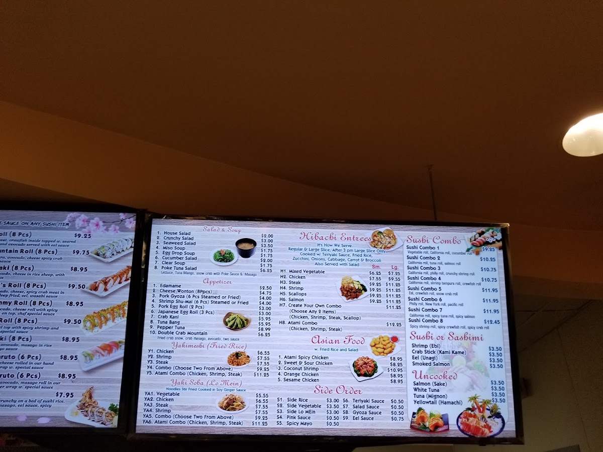 Guests can enjoy a variety of sushi, including staples like California Roll, as well as fresh cuts of salmon, tuna, and yellowtail. Warming plates such as Atami Spicy Chicken, Sesame Chicken, and Chicken Fried Rice pair well with the welcoming, relaxed atmosphere, where meals feel both nourishing and easygoing.